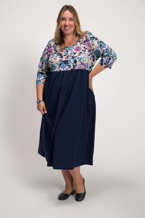 Abstract Top Print Empire Knit Dress - simple design with just a dash of color. Round neck. 3/4 sleeves, gathered empire waist and side seam pockets. A-line swing shape.