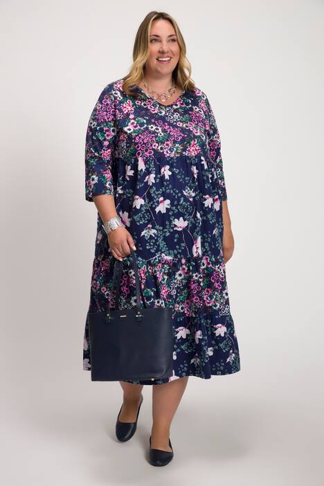Navy Floral Two Print Knit Empire Dress - a print mix with flowers in shades of pink. V-neck, 3/4 sleeves, gathered empire waist and side seam pockets. We are sure this will become a new season favorite. A-line swing shape.