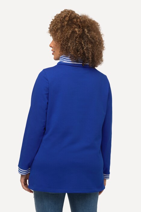 Stripe Accent Draped Collar Sweatshirt - stylish, soft, and comfortable with stripe accents on the stand-up draped collar, long sleeve cuffs, and pockets. Leather look details.